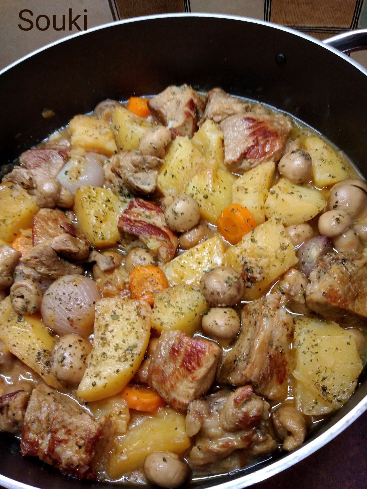 Το τρυφερό χοιρινό σιγομαγειρεύεται με πατάτες, καρότο και μανιτάρια, δημιουργώντας μια πλούσια σάλτσα και μια υφή που λιώνει στο στόμα.