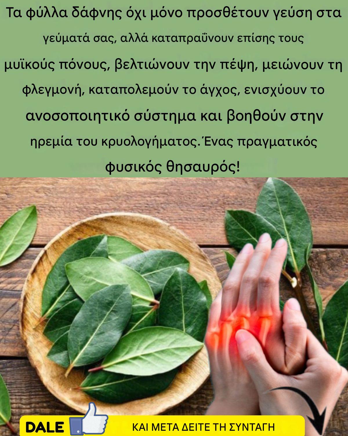 Τα φύλλα δάφνης δεν είναι μόνο ένα αρωματικό συστατικό για τα φαγητά μας – είναι ένας θησαυρός για την υγεία μας. Χρησιμοποιούνται εδώ και αιώνες στη φυσική ιατρική για να καταπολεμήσουν πόνους, φλεγμονές, και να ενισχύσουν το ανοσοποιητικό. Ας δούμε πώς μπορείς να τα εντάξεις στην καθημερινότητά σου.