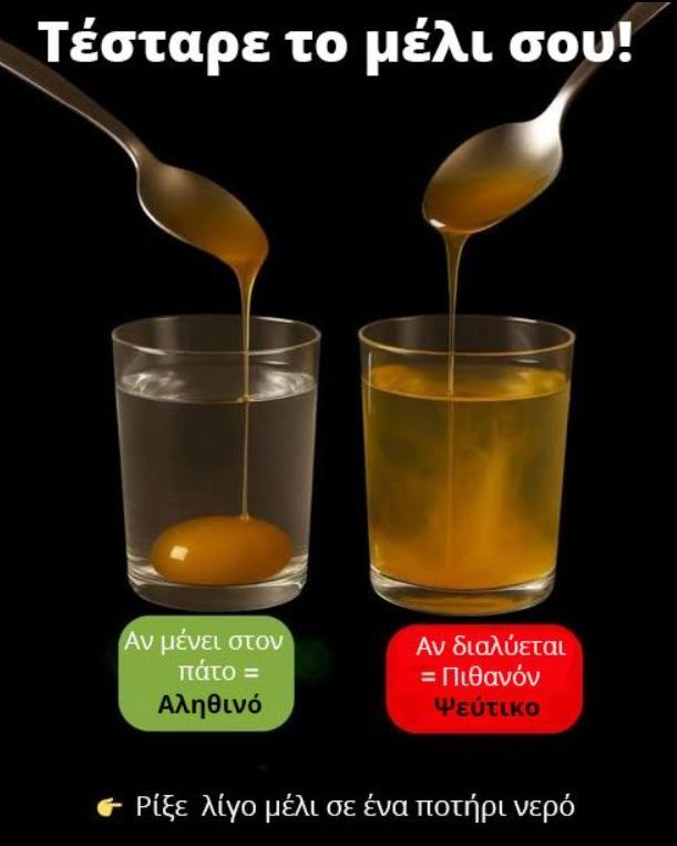 Βήμα: Βάλτε ένα κουτάλι μέλι σε ένα ποτήρι νερό. Αν κατακάθεται — λένε — είναι αληθινό.