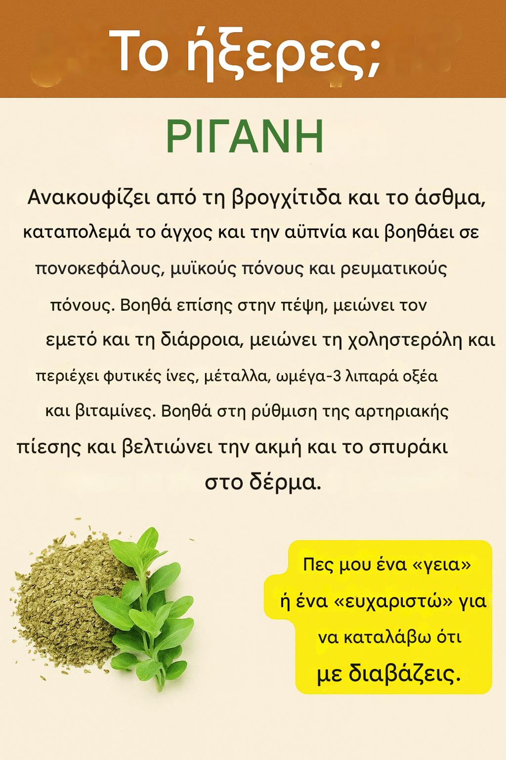 Γνωρίζατε ότι η ρίγανη, το αρωματικό βότανο που δίνει ζωή στα πιάτα σας, είναι ένας φυσικός θησαυρός γεμάτος οφέλη για την υγεία; Πολύ περισσότερο από ένα απλό καρύκευμα, η ρίγανη (Origanum vulgare) είναι μια υπερτροφή που λατρεύεται στην παραδοσιακή κινεζική, μεσογειακή και λατινοαμερικανική ιατρική για τις αντιοξειδωτικές, αντιμικροβιακές και αντιφλεγμονώδεις ιδιότητές της. Από την ενίσχυση του ανοσοποιητικού συστήματος έως τη βελτίωση της πέψης, αυτό το βότανο μπορεί να φέρει επανάσταση στην ευεξία σας. Ετοιμαστείτε να ανακαλύψετε τα απίστευτα οφέλη της ρίγανης και πώς να την ενσωματώσετε στη ζωή σας για να νιώθετε πιο υγιείς και πιο ζωντανοί! Συνεχίστε να διαβάζετε και μαγευτείτε από αυτό το πράσινο στολίδι που θα μεταμορφώσει τη ρουτίνα σας.